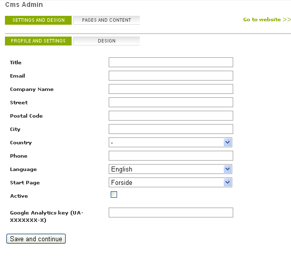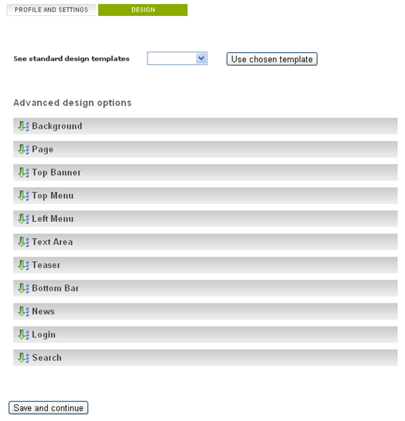 Selecting the tab "Design", you can select various design options for your website and save them on clicking the "Save and continue" button.