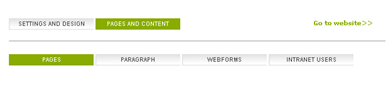 Note: Pages and Paragraph are default sub-tabs whereas Webforms and Intranet Users are non-default sub-tabs, i.e. you need to buy those features if you intend to use them.