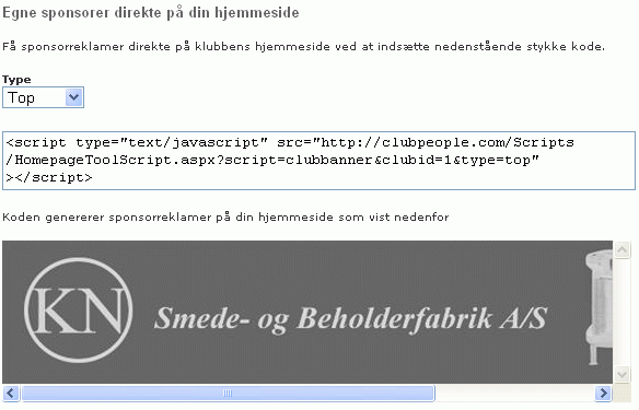 When the type is selected, click "Update" and the code in the field below will be generated. This code is inserted on the website, and the sponsor banners will be shown and managed from ClubPeople.