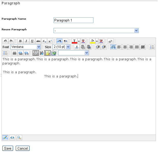 After entering the information, you can save the paragraph by clicking on the "Save" button or cancel the paragraph by clicking the "Cancel" button.
